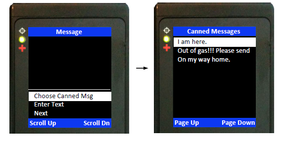 When a canned message is selected from the list, for example ‘Out of gas!!! Please send’ as shown in the figure below, the Details screen will appear to show the complete message. User has the option to pick a canned message by pressing the enter button to Select or the BACK button to go back to the original list of canned messages. If the enter button is pressed, the Message menu will re-appear with the selected canned message displayed in the text box. Scroll Up and Scroll Dn soft keys are used to view part of the canned message that does not fit inside the text box. Remove Canned Msg deletes the message from the text box at anytime even after free-text is entered.
