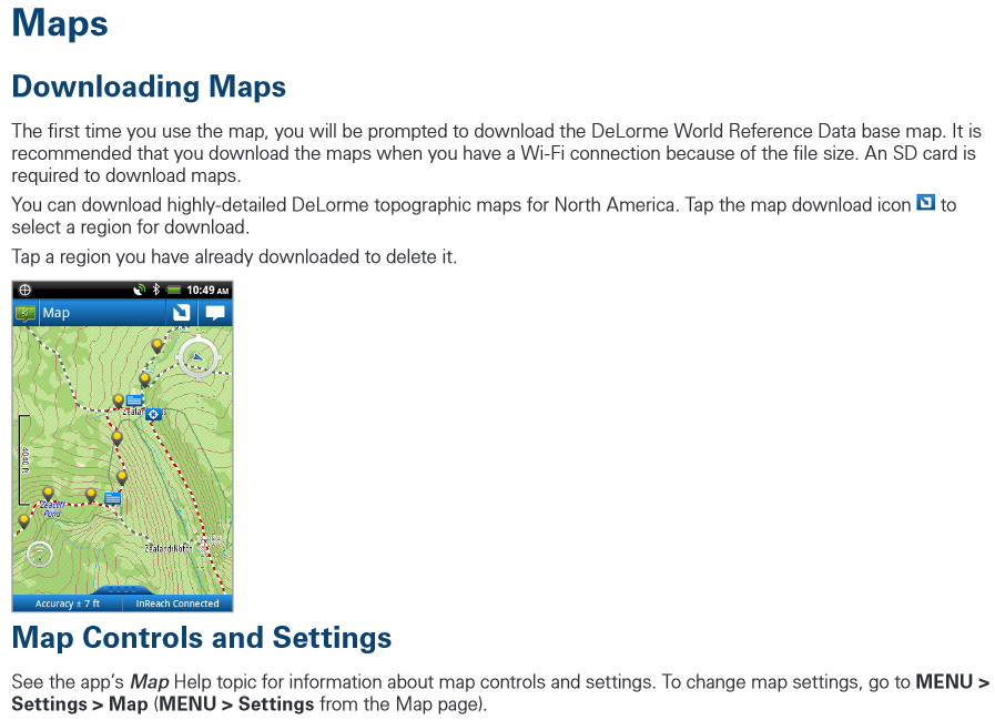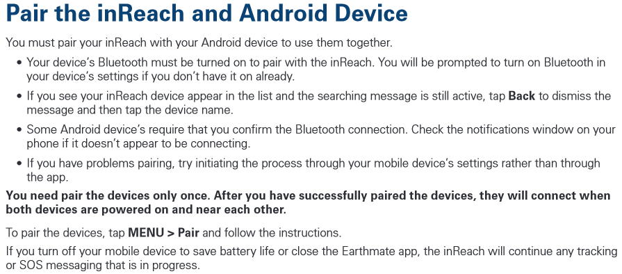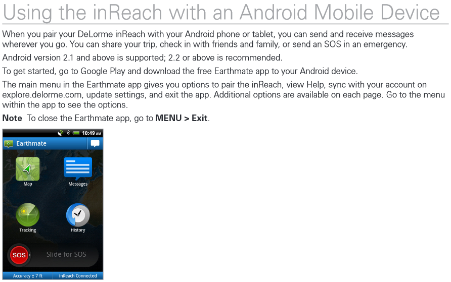 When you use the inReach’s tracking feature with the Earthmate app on your Android device, you can set the interval for sending tracking points to the map at explore.delorme.com. The tracking points recorded while the Android device and the inReach are connected are visible on the map in the Earthmate app.